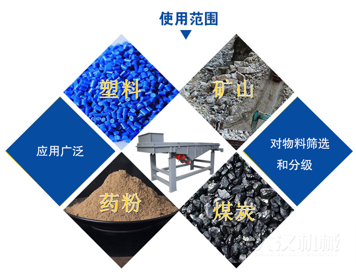 直線振動篩可對粉狀、顆粒狀物料的篩選和分級,廣泛應用于塑料、磨料、石英砂、化工、醫藥、建材、糧食、炭素、化肥等行業。