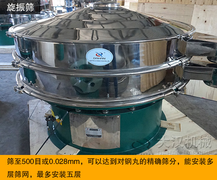 旋振篩篩網采用獨特的設計,網孔不堵塞,粉末不飛揚,可以篩至500目或0.028mm。可以達到對鋼丸的篩分。