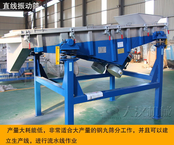 直線振動篩采用振動電機激振作為振動源,使物料在篩網上被拋起,同時向前做直線運動,物料從給料機均勻地進入篩分機的進料口,通過多層的篩網產生多種規格的篩上物、篩下物,分別從各自的出口排出。直線振動篩可以分離多種規格的鋼丸。適用于對其篩選和分級。